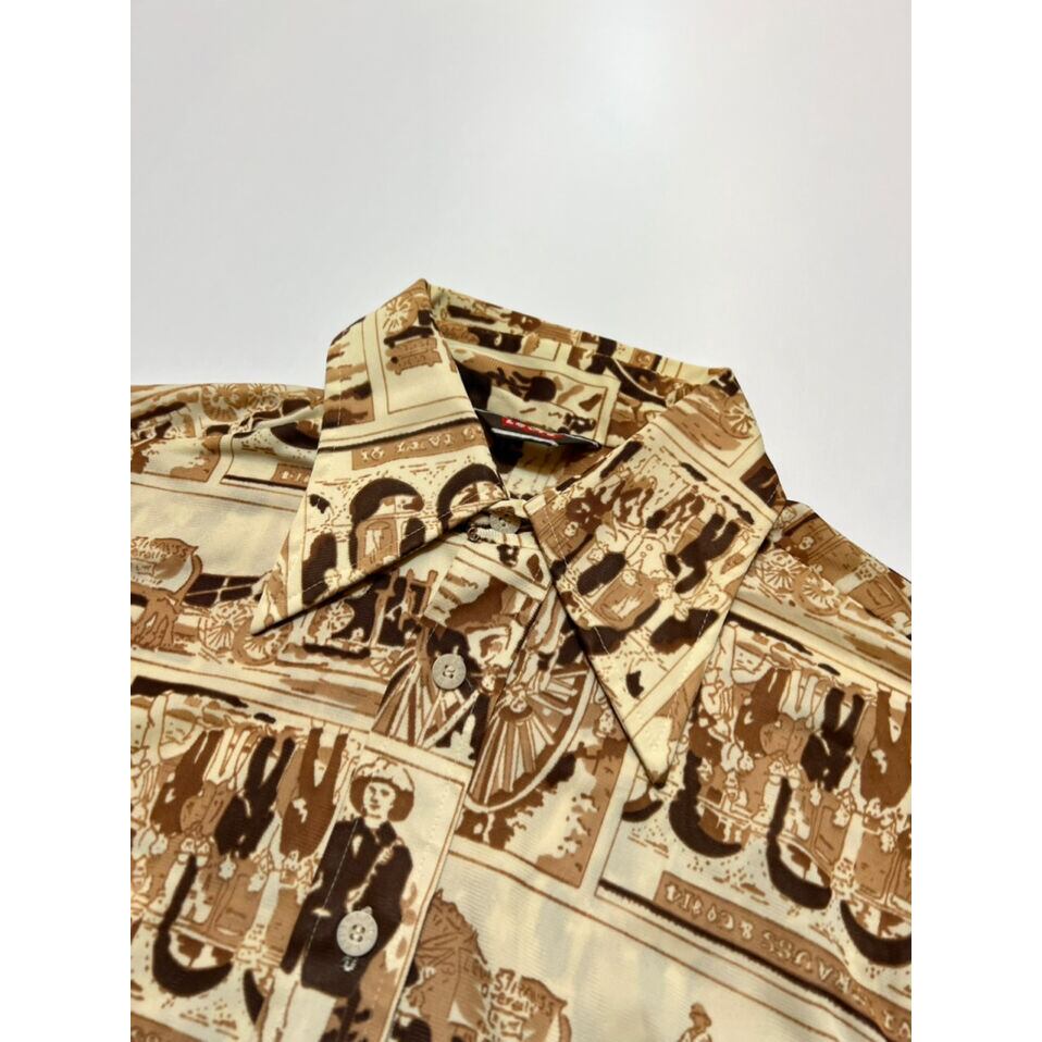 70s Levi's Size M程 実寸 約肩幅47cm身幅54cm着丈72cm袖丈61cm 70年代ごろのリーバイスの総柄シャツ。 当ブランドの創業当初のフォトを絵にしたグラフィックが最高‼︎ 素材表記御座いませんが恐らくレーヨン系のサラッとしており光沢のある上品な生地感。 スッキリタイト目なM程のサイズ感‼︎ お好きな方は是非‼︎ 着用モデル 身長180cm コンディション その他使用感の少ないコンディションです。