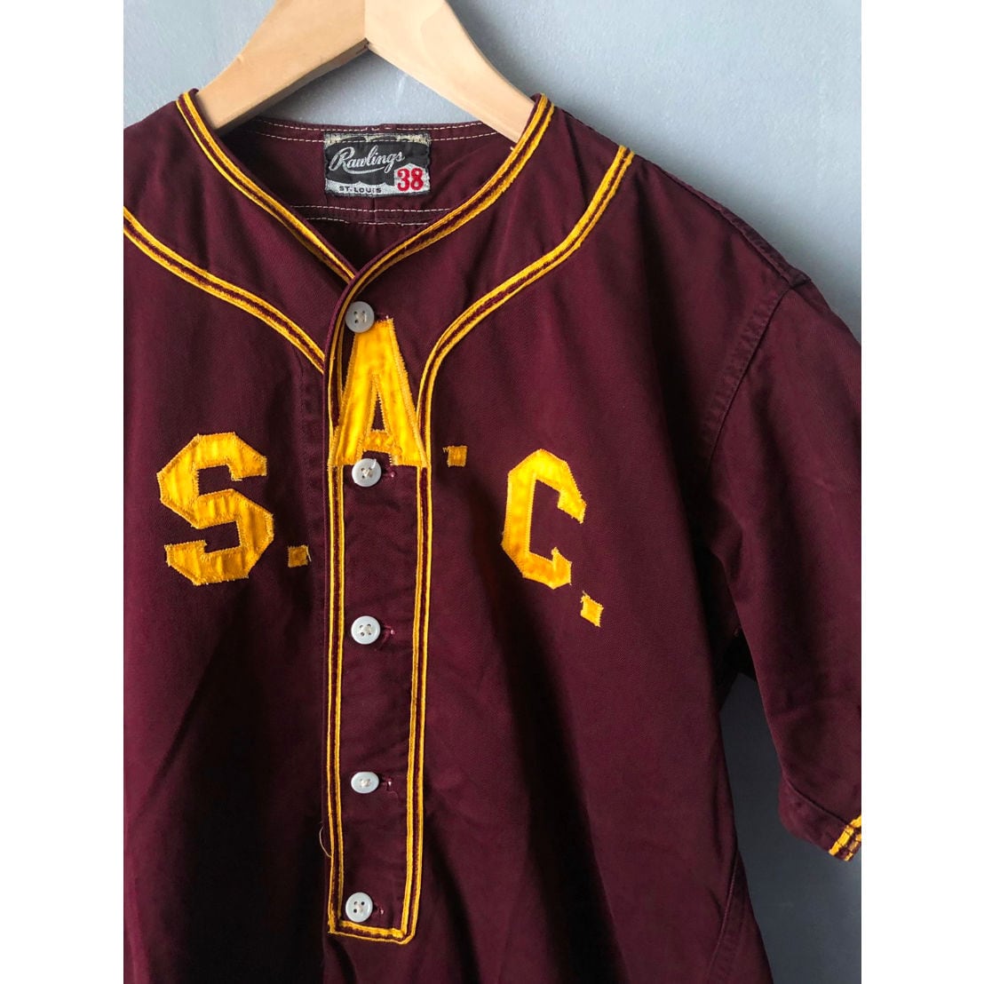 50s RawLings BASEBALL SHIRT Size38 実寸 約肩幅45cm身幅51cm着丈70cm袖丈21cm 50年代のRaw lings BASEBALL SHIRT!! この年代のシャツはウール素材が多いですが、こちらはオールシーズン通して使いやすい、コットン素材になってます!! サイズは38で男女ともにおすすめです!! 着用モデル 身長170cm コンディション バックにレターワッペンを取った後がございます。 写真でご確認下さい。